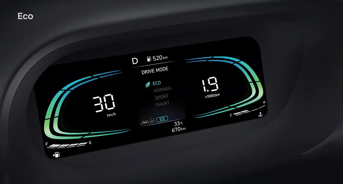 New STARGAZER hadir dengan empat gaya berkendara. Normal untuk mengemudi sehari-hari, Eco untuk efisiensi bahan bakar, Sport untuk performa kendaraan yang lebih maksimal, dan Smart yang secara otomatis menyesuaikan interval perpindahan gigi berdasarkan pola pengemudi
